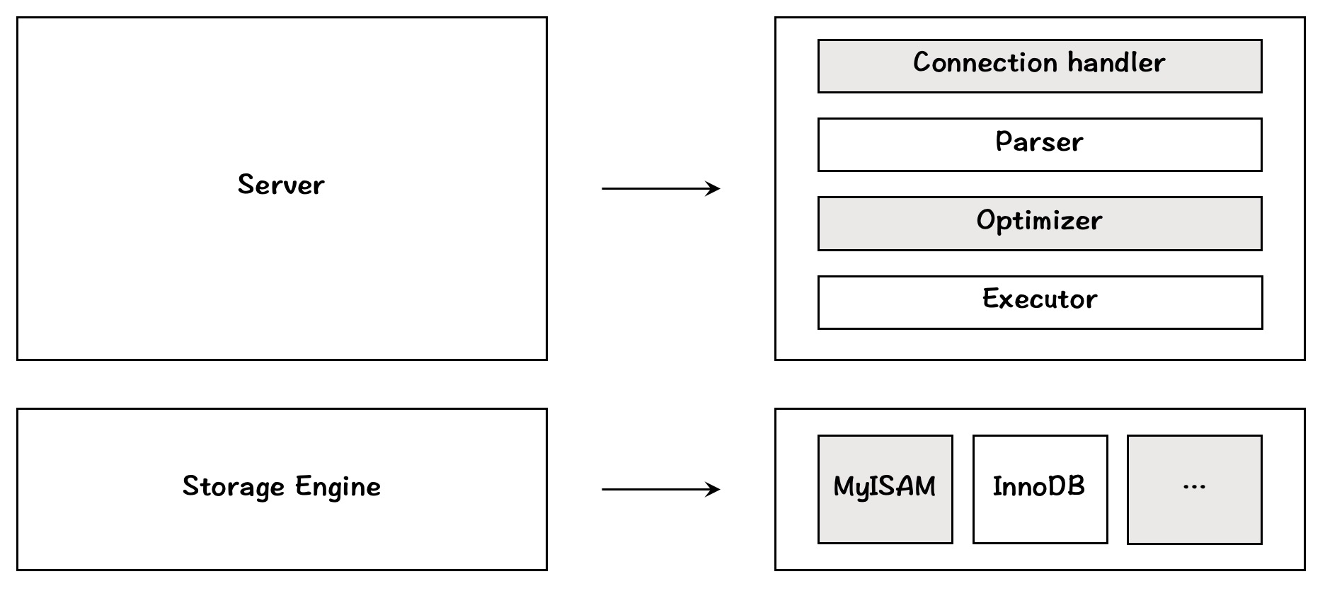 如图所示是一个关系型数据库系统的简单架构图,可以看到数据系系统是一个典型的 CS 架构。以 MySQL 为例,一个典型的数据库系统通常由两部分组成:Server 和 Storage Engine。Server 层按照功能划分又可以分为:连接处理(Connection handler)、语法解析(Parser)、优化器(Optimizer)、执行器(Executor)等部分。Storage Engine 也可以有不同的实现方式。