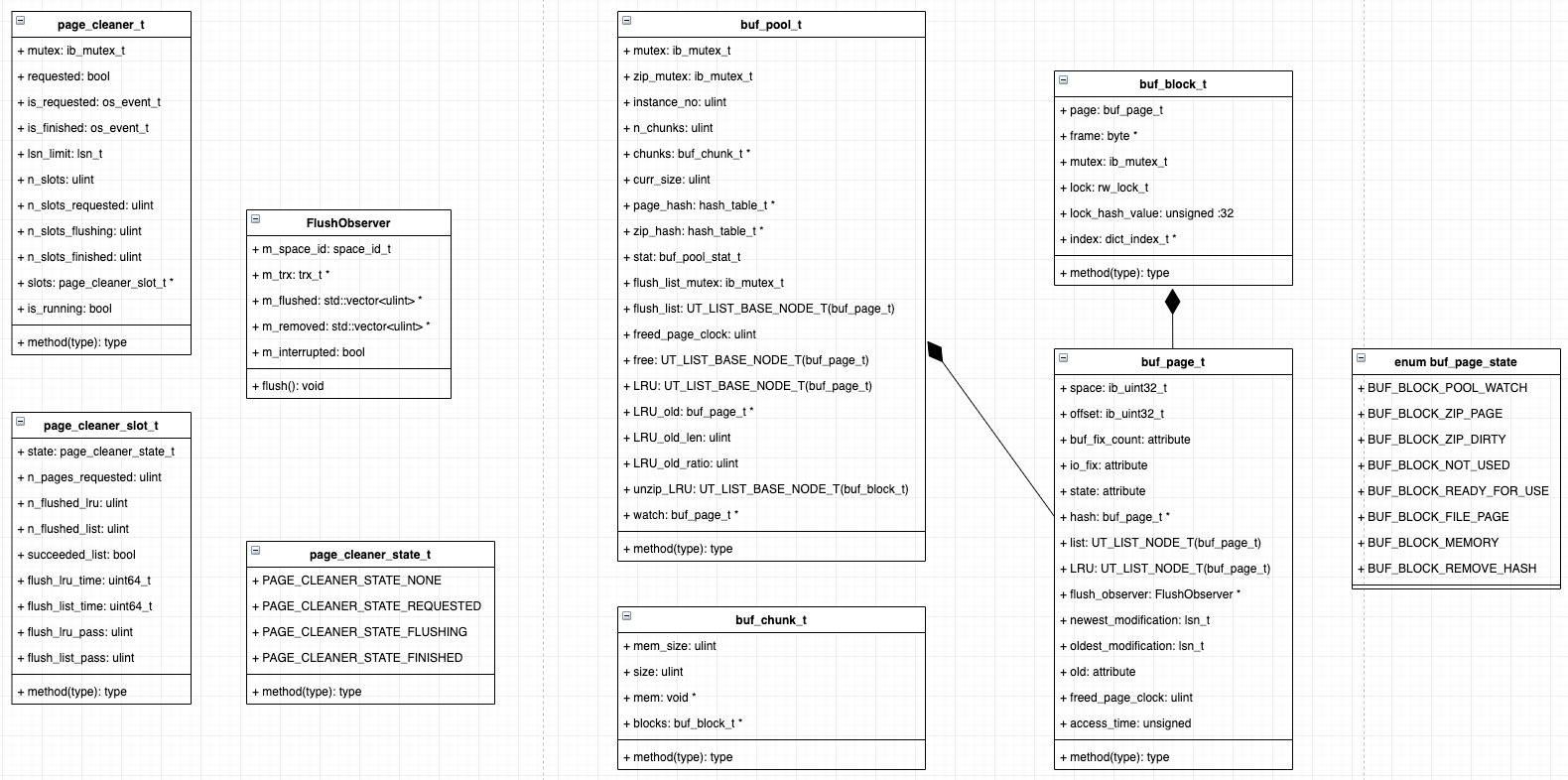 |--> buf_flush_page_cleaner_thread | |--> os_event_wait(page_cleaner->is_requested) | |--> pc_flush_slot | | |--> buf_flush_LRU_list | | | |--> buf_flush_do_batch(BUF_FLUSH_LRU) | | | | | |--> buf_flush_do_batch(BUF_FLUSH_LIST) | | | |--> buf_flush_batch | | | | |--> buf_do_LRU_batch | | | | | |--> buf_free_from_unzip_LRU_list_batch | | | | | |--> buf_flush_LRU_list_batch | | | | | | |--> buf_LRU_free_page | | | | | | |--> buf_flush_page_and_try_neighbors | | | | | | | |--> buf_flush_try_neighbors | | | | | | | | |--> buf_flush_page | | | | | | | | | |--> buf_do_flush_list_batch | | | | | |--> buf_flush_page_and_try_neighbors