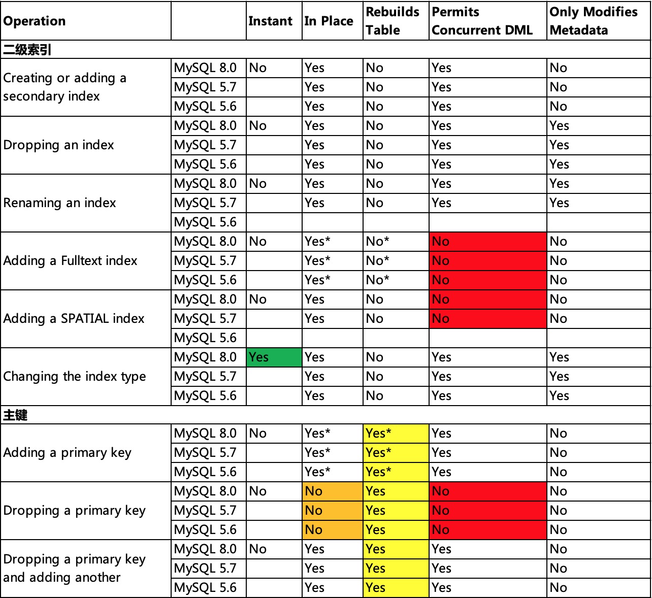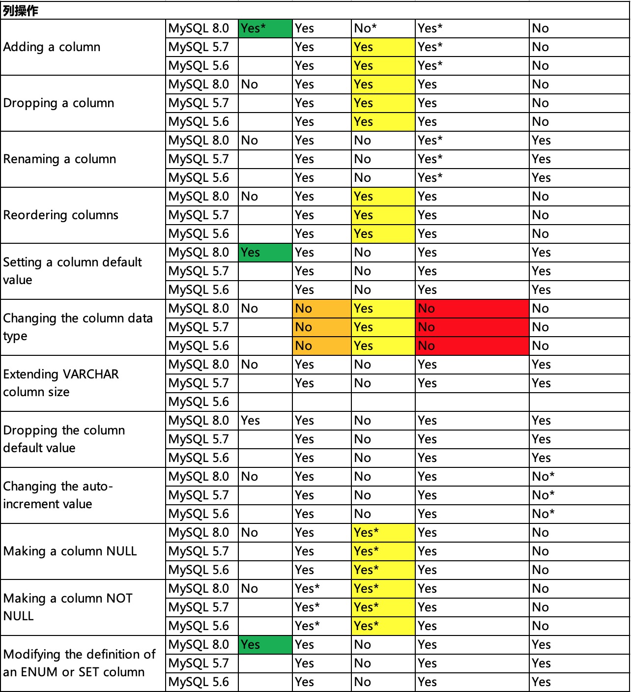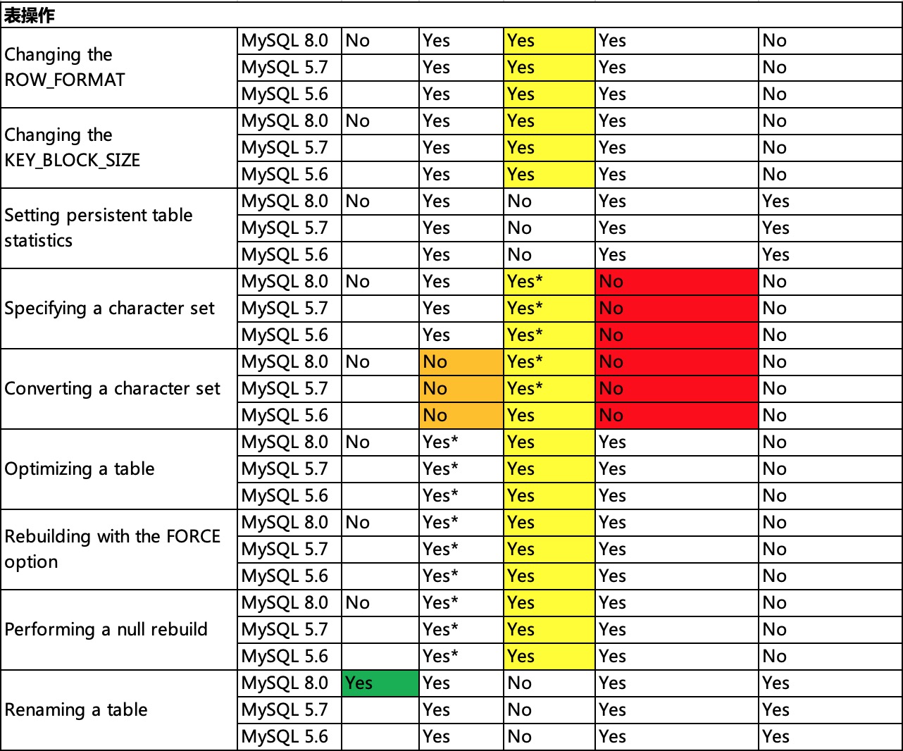 结合上面的表格,对 MySQL 当前 DDL 的执行模式总结如下: