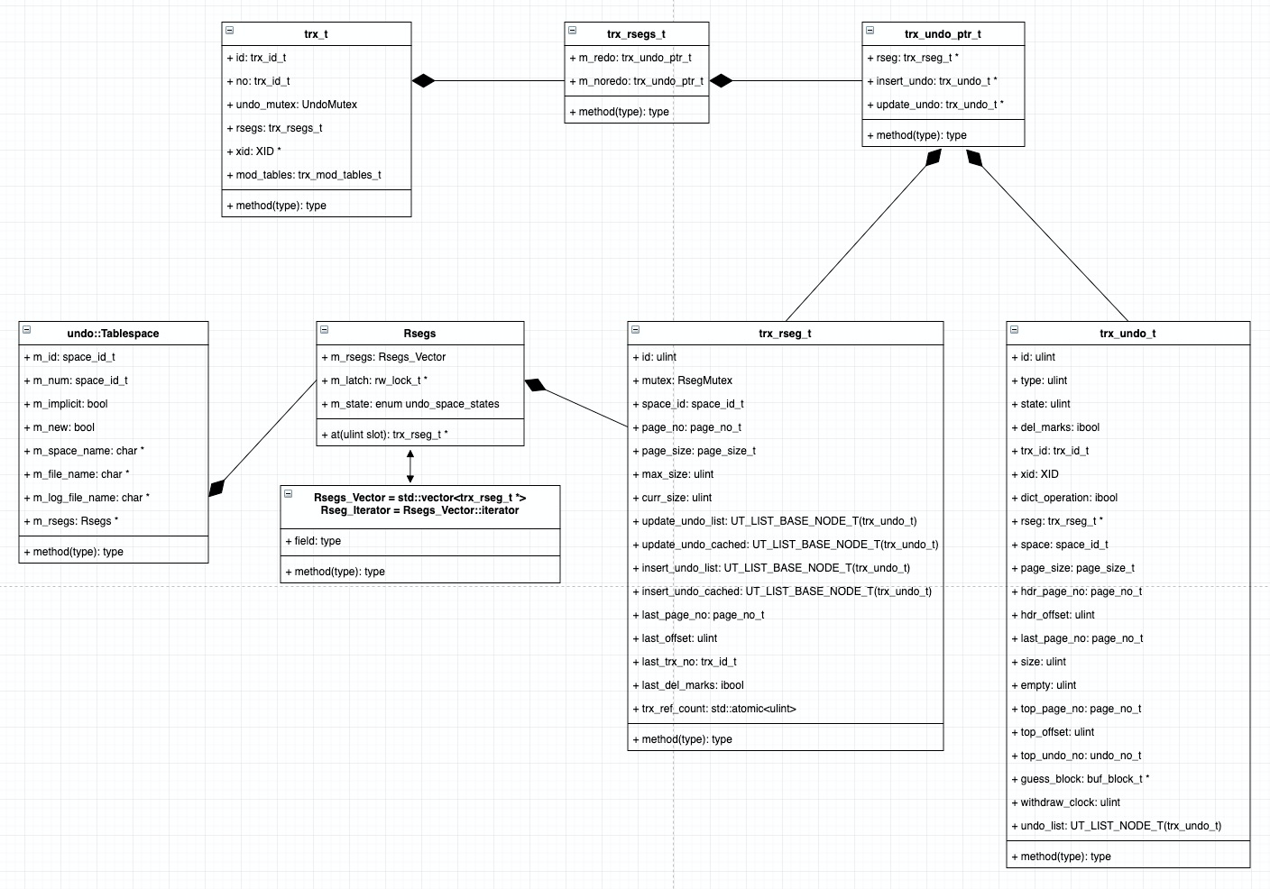 1 2 3 4 5 6 7 8 9 10 11 12 13 14 15 16 17 18 19 20 21 22 23 24 25 26 27 28 29 30 31 32 33 34 35 36 37 38 39 40 41 42 43 44 45 46 47 48 49 dberr_t  trx_undo_report_row_operation (...)    ...   err = trx_undo_assign_undo(trx, undo_ptr, TRX_UNDO_UPDATE);      ...   offset = trx_undo_page_report_modify(undo_page, trx, index, rec, offsets,                                        update, cmpl_info, clust_entry, &mtr);      ...   *roll_ptr = trx_undo_build_roll_ptr(op_type == TRX_UNDO_INSERT_OP,                                       undo_ptr->rseg->space_id, page_no, offset);      ... } dberr_t  trx_undo_assign_undo (     trx_t  *trx,                    trx_undo_ptr_t  *undo_ptr,      ulint type)                  ...   undo = trx_undo_reuse_cached(trx, rseg, type, trx->id, trx->xid, &mtr);        ...   err = trx_undo_create(trx, rseg, type, trx->id, trx->xid, &undo, &mtr); } static  MY_ATTRIBUTE ((warn_unused_result))  dberr_t     trx_undo_create (trx_t  *trx, trx_rseg_t  *rseg, ulint type, trx_id_t  trx_id,                      const  XID *xid, trx_undo_t  **undo, mtr_t  *mtr)    ...   rseg_header = trx_rsegf_get(rseg->space_id, rseg->page_no, rseg->page_size, mtr);   err = trx_undo_seg_create(rseg, rseg_header, type, &id, &undo_page, mtr);   ...   page_no = page_get_page_no(undo_page);   offset = trx_undo_header_create(undo_page, trx_id, mtr);   trx_undo_header_add_space_for_xid(undo_page, undo_page + offset, mtr);   *undo = trx_undo_mem_create(rseg, id, type, trx_id, xid, page_no, offset);   ... }