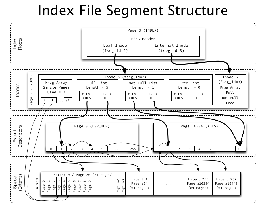注:FREE、FREE_FRAG、FULL_FRAG 列表中的元素为 XDES Entry;FULL_INODES、FREE_INODES 列表中的元素为 INODO Page。