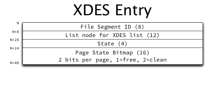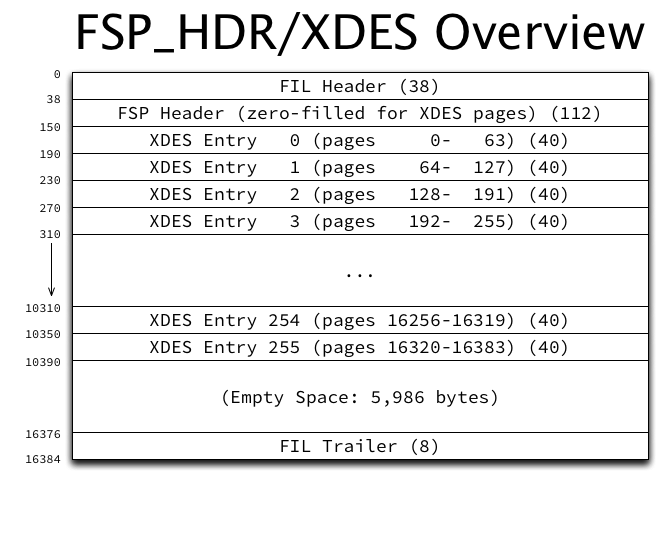 前面已经提到,每 256 个 Extent 会有一个单独的 FSP_HDR/XDES 进行管理,与 FSP_HDR Page 的区别在于,XDES Page 的 FSP Header 部分为空,其它部分相同。每一个 Extent 由 1 个单独的 XDES Entry 进行管理