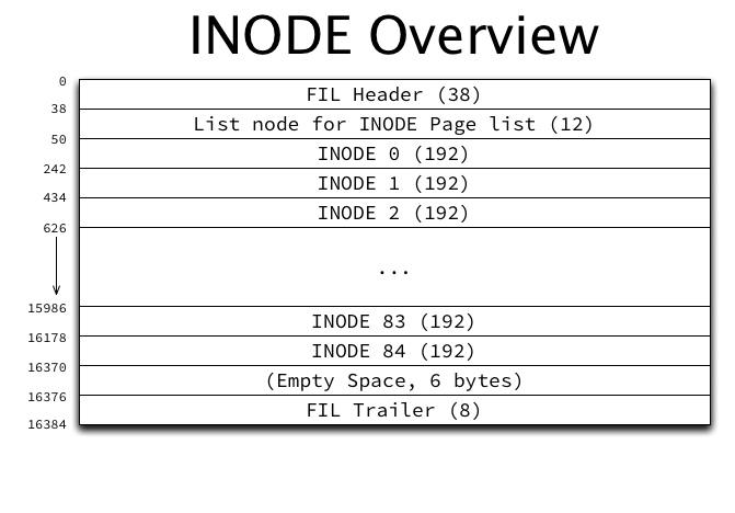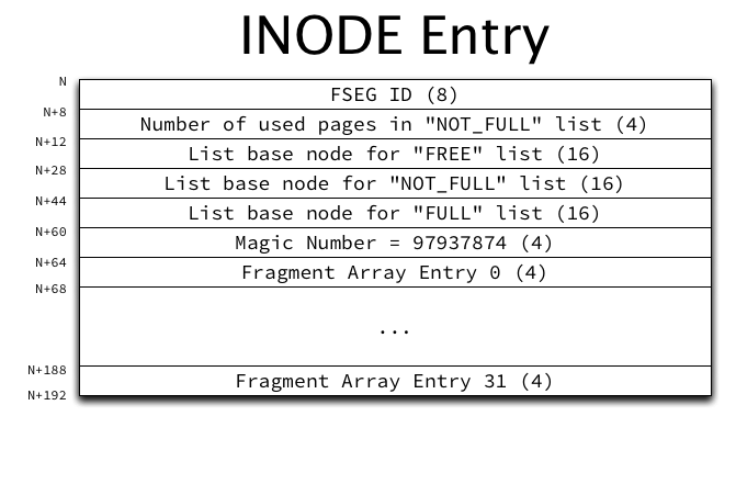 INODE 这个命名是 InnoDB 里面比较容易让人混淆的概念之一,参考文献中给出了一个说法 file segment INODE,INODE Page 中包含了 85 个 INODE Entry,每个 INODE Entry 描述一个 file segment(FSEG)。